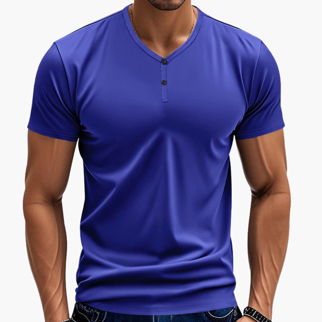 A men’s Henley T-shirt with a textured V neckline and button placket