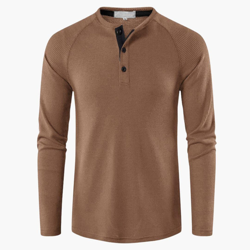 Men’s long sleeve T-shirt featuring a Henley neckline